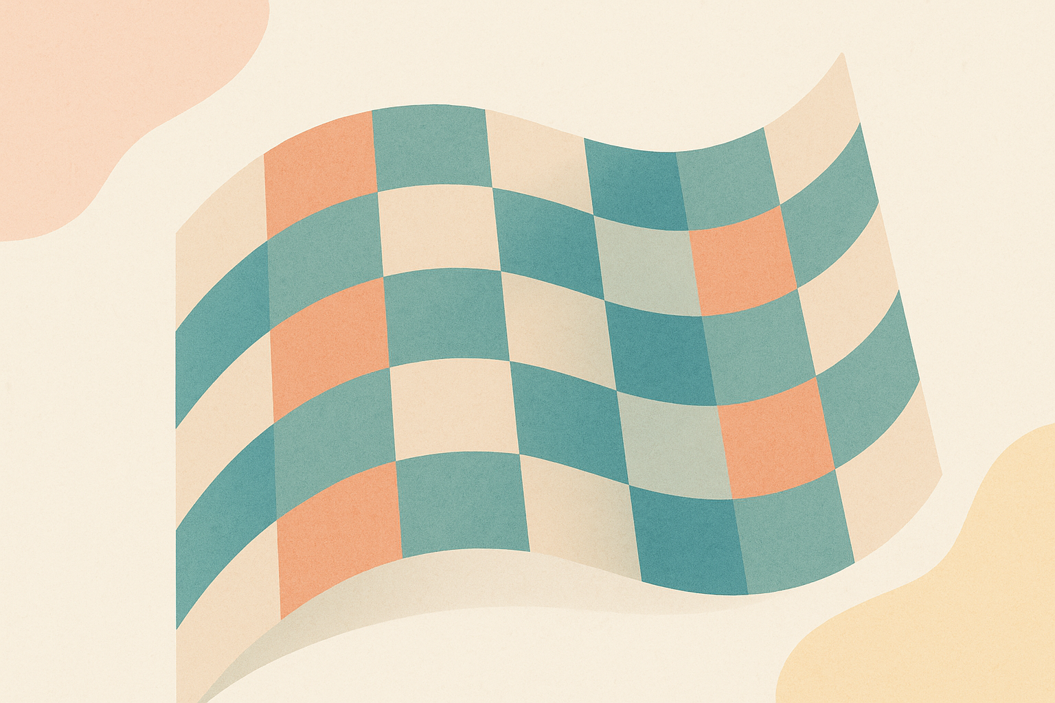 Illustration vectorielle au style rétro pastel avec des éléments de course : drapeau à damier noir et crème, trophée à carreaux, casque rouge, chronomètre, étoile, flèches et fanions verts. Palette douce de beige, vert foncé, rouge brique et jaune moutarde, avec une composition en bas de l'image laissant un grand espace vide en haut pour le texte ou le message.