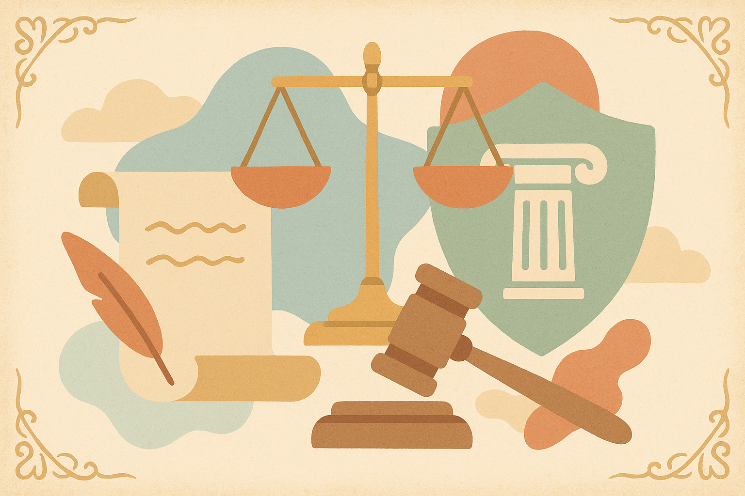 Illustration vectorielle dans des tons beige, ocre et brun, représentant une balance de justice, un marteau de juge, un rouleau de parchemin, un livre de droit, une colonne grecque et des éléments décoratifs comme une étoile et des feuilles. Style plat, épuré et professionnel, parfait pour les cartes postales liées au domaine juridique ou institutionnel.