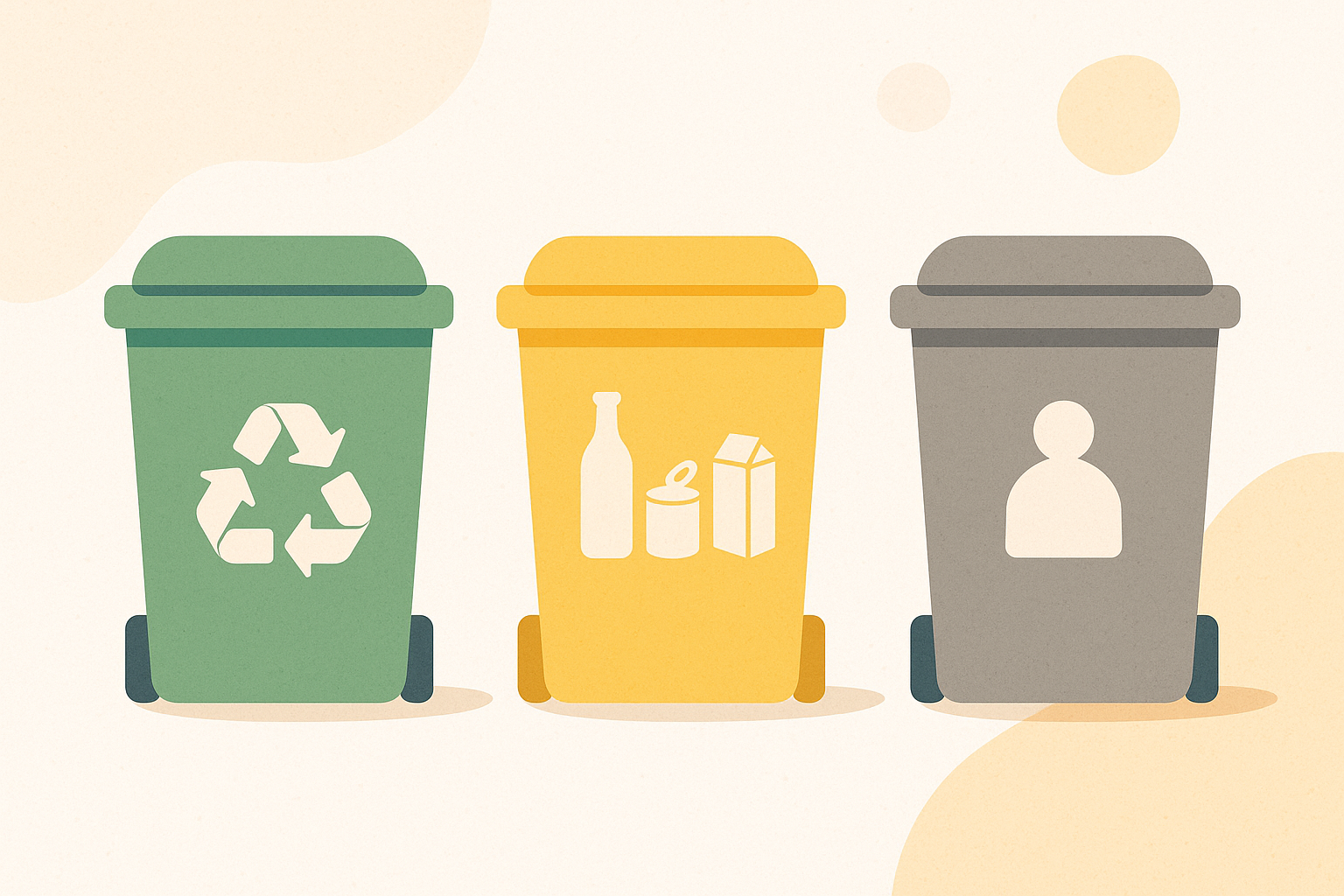 Illustration minimaliste de trois poubelles de tri sélectif en vert, jaune et gris sur fond beige texturé. Icônes de feuille, bouteille et symbole de recyclage sur les bacs. Éléments décoratifs autour : tranche de pain, bouteille bleue, savon, formes abstraites pastel. Style plat, doux et épuré, ambiance écologique et professionnelle.