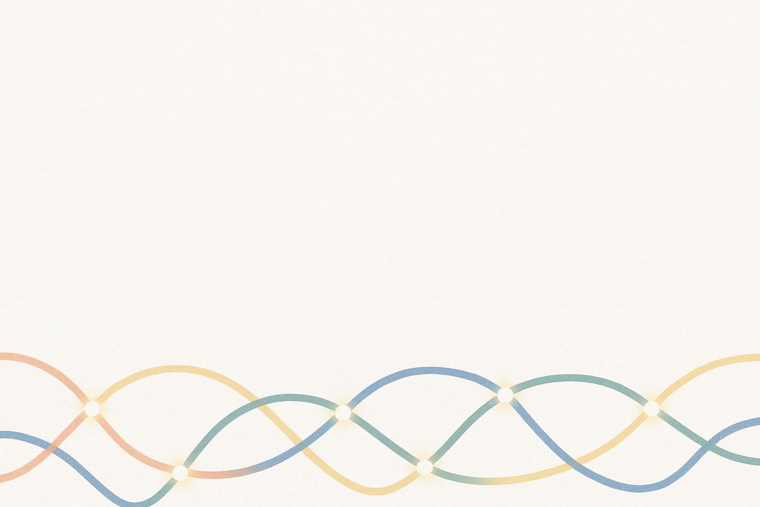 Fond crème texturé avec des vagues entrelacées en dégradés pastel de bleu, vert, jaune et orange, soulignées par des points blancs lumineux aux intersections. Design minimaliste, fluide et géométrique, parfait pour un usage professionnel. Lignes douces et harmonieuses évoquant la connexion, la fluidité et la modernité.