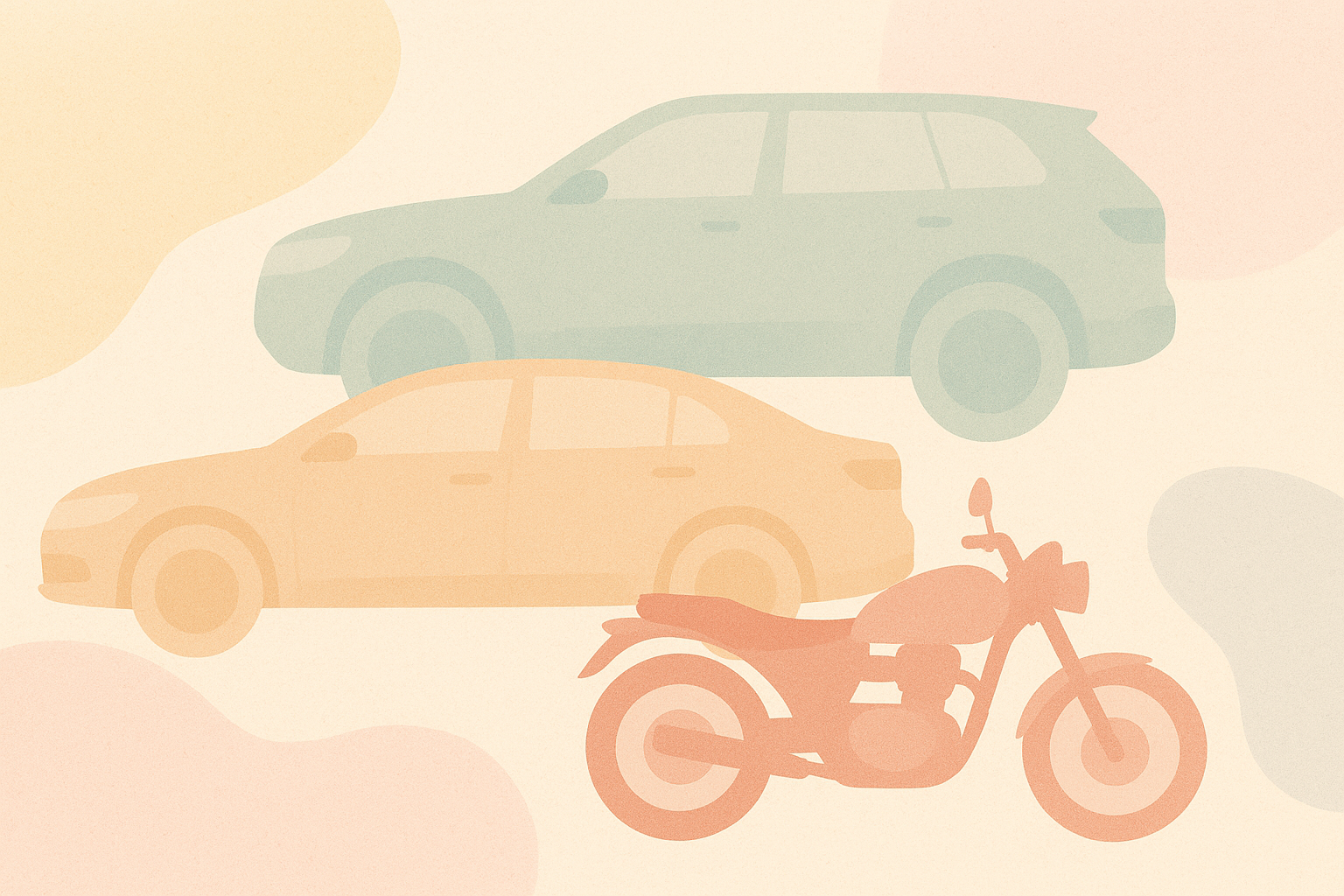 Illustration minimaliste avec silhouettes semi-transparentes de trois véhicules : une voiture beige, un SUV bleu clair et une moto orange, sur fond blanc cassé. Le style est épuré, avec des formes simples et des couleurs pastel douces, créant une ambiance professionnelle et contemporaine adaptée aux secteurs de l'automobile, du transport ou de la mobilité.
