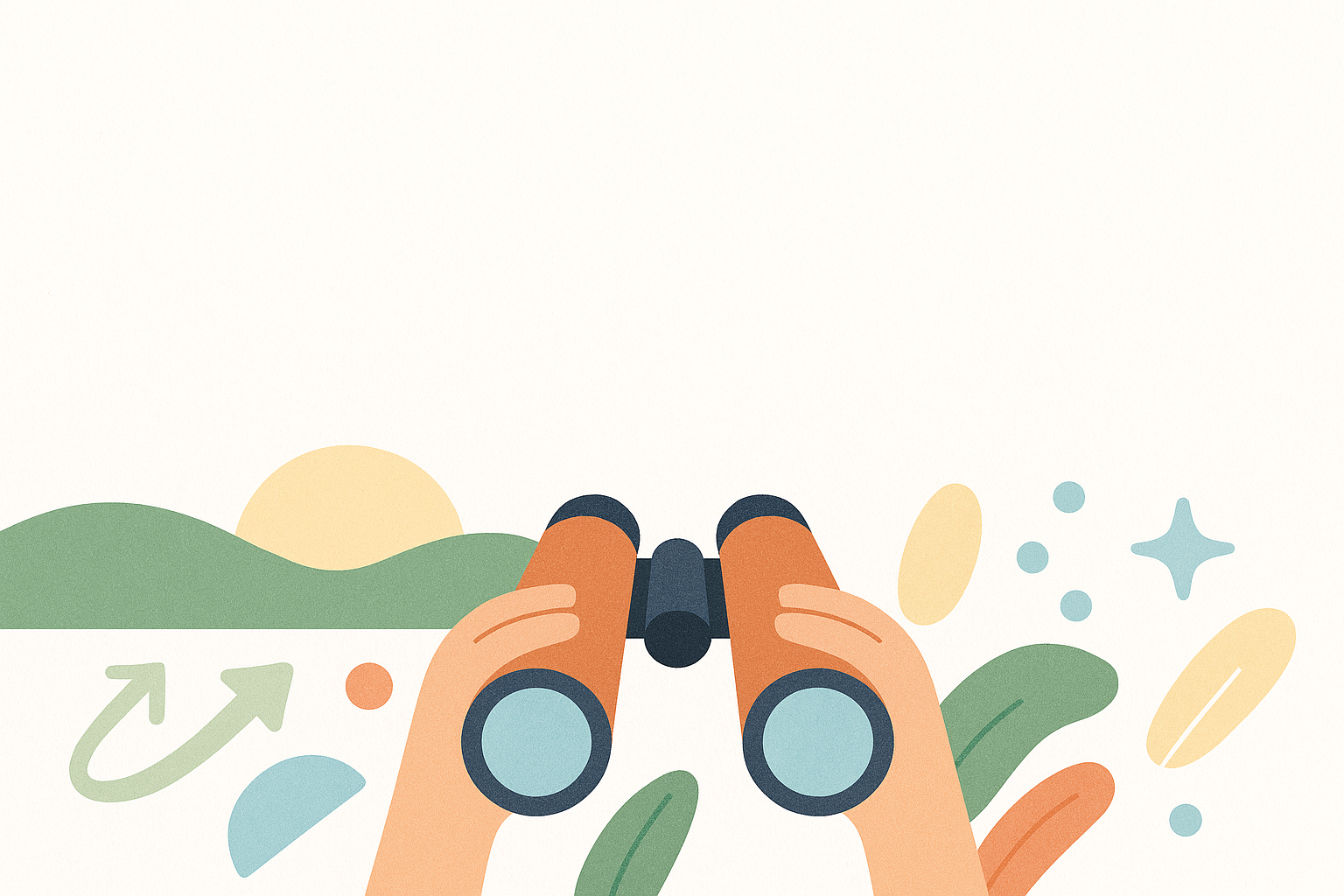 Illustration vectorielle minimaliste avec jumelles orange et bleu tenues par deux mains, sur fond de paysage abstrait avec collines vertes, soleil jaune pâle, flèches vert clair, formes organiques et éléments décoratifs pastel (bleu, jaune, vert, orange). Style plat, couleurs douces et harmonieuses, ambiance professionnelle et optimiste.